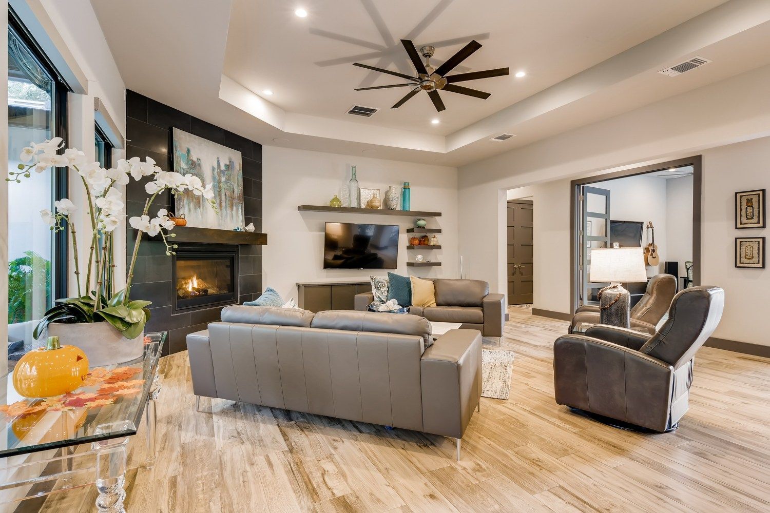 Bold slatted siding, clean landscaping, and stacked stone bring fresh, modern energy to a thoughtfully and excitingly elegant design.