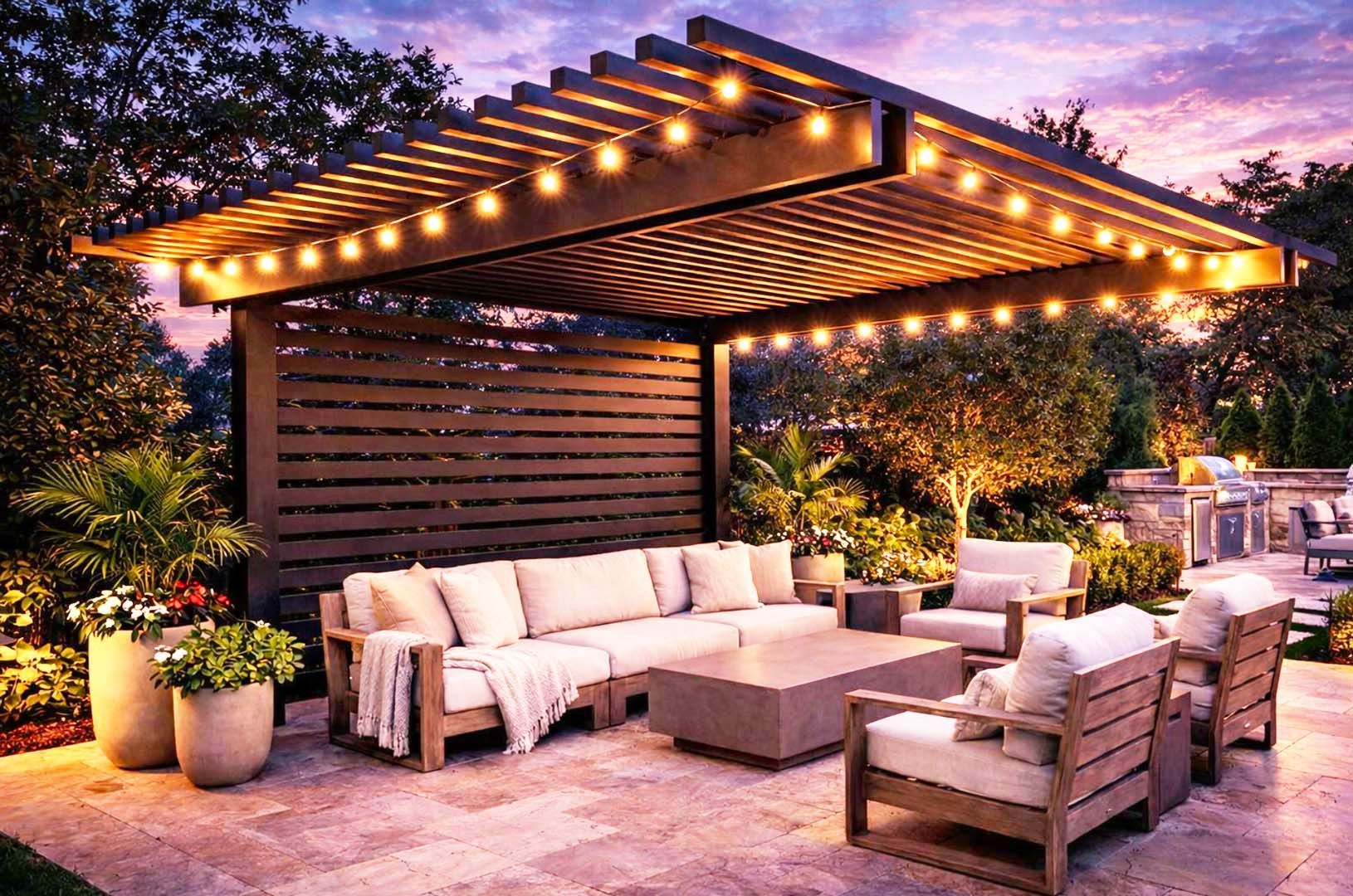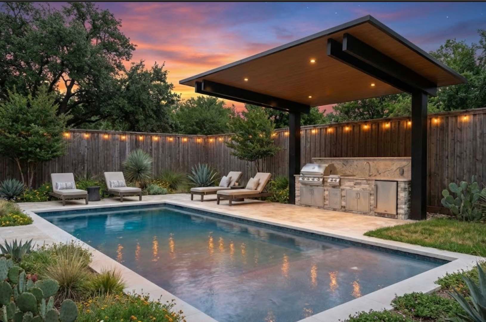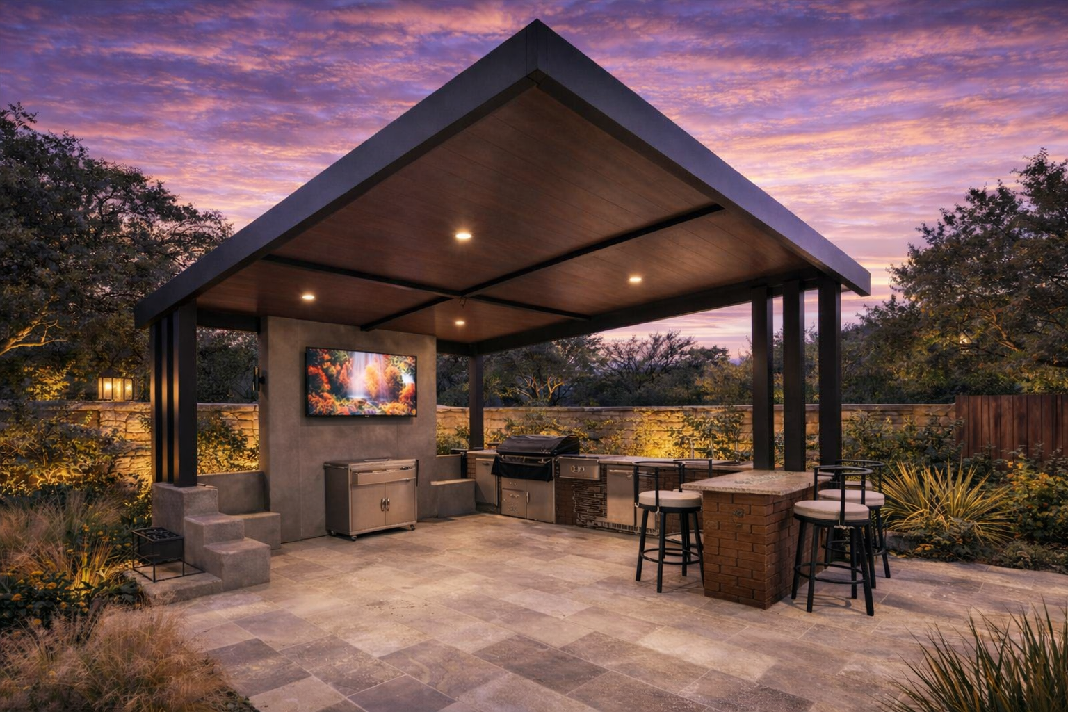 Designed for the rhythm of Texas Hill Country living, this custom cantilever pergola blends modern architecture with warm natural textures. Built for sunset dinners, game-day gatherings, and year-round connection.