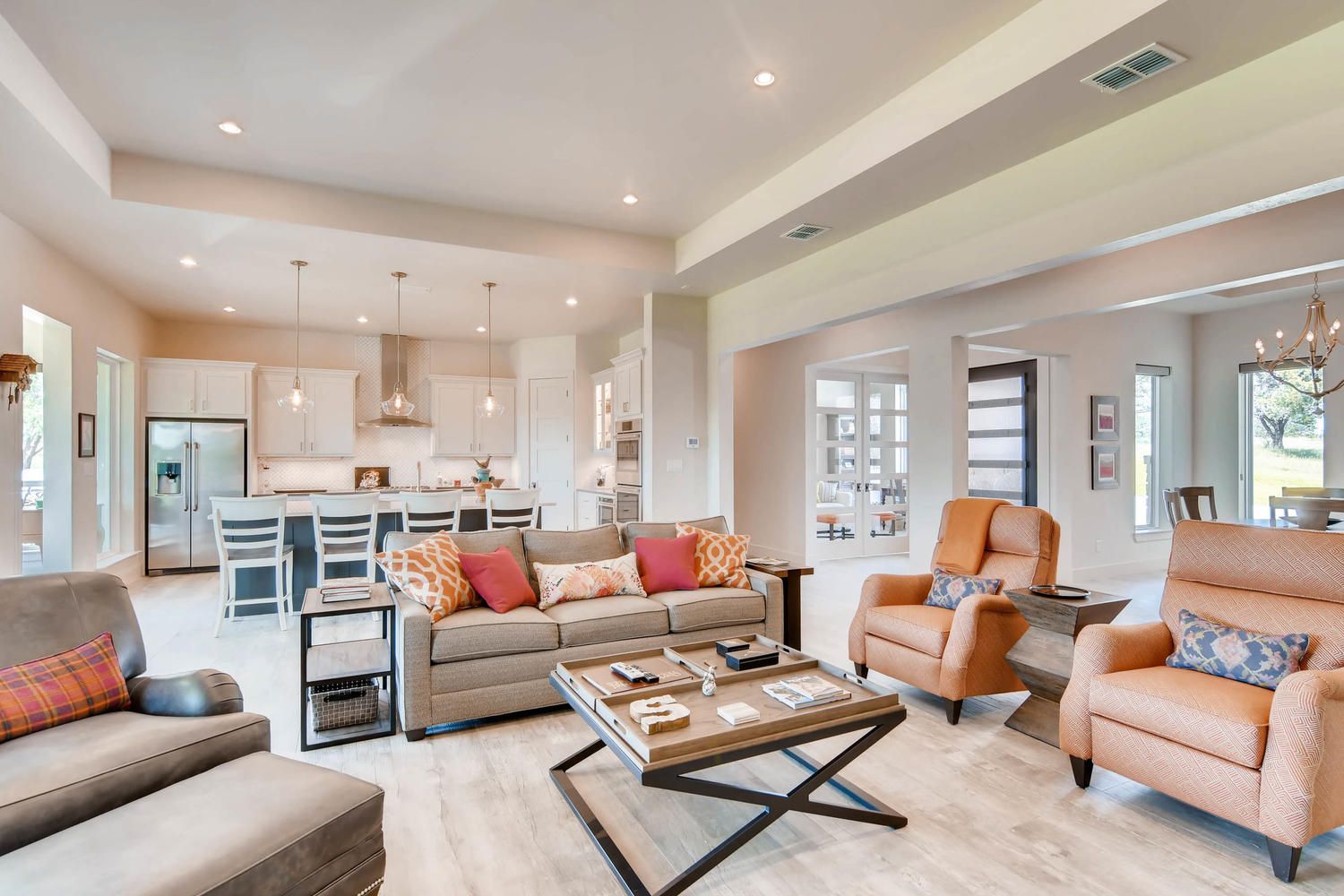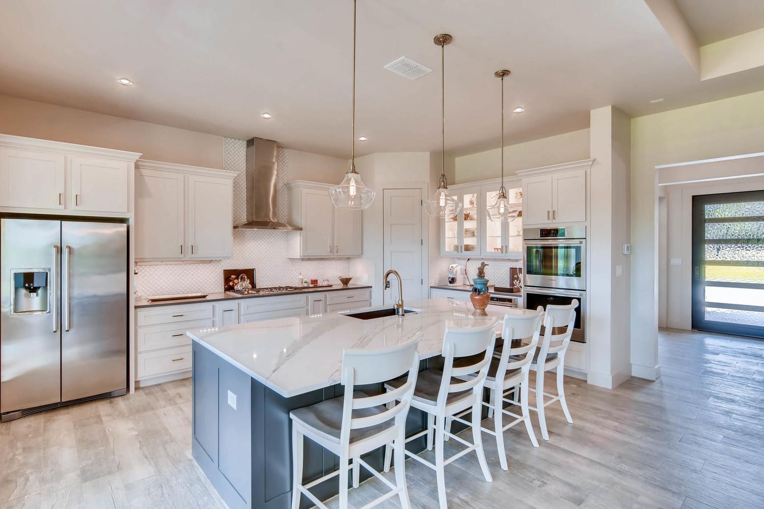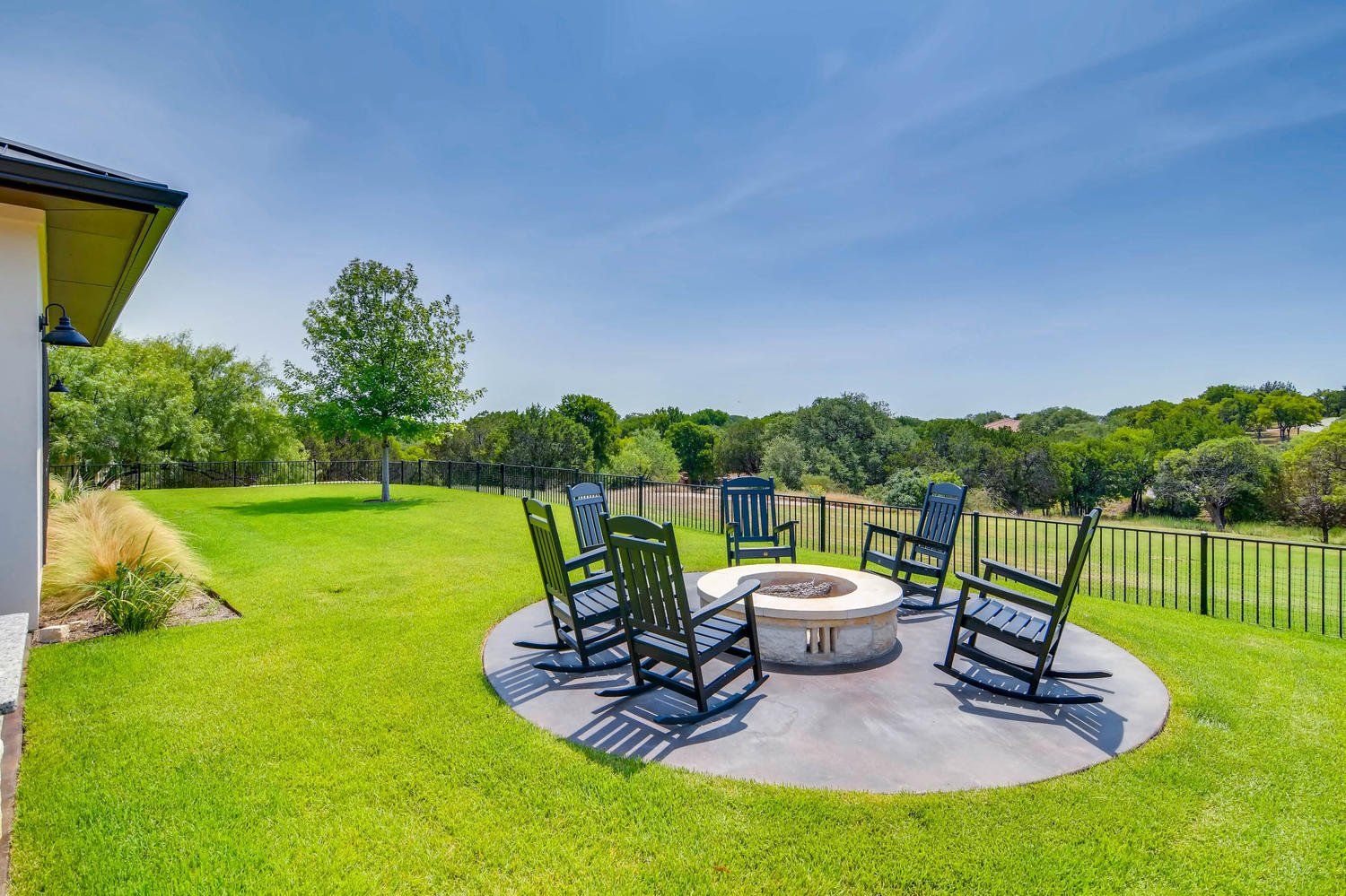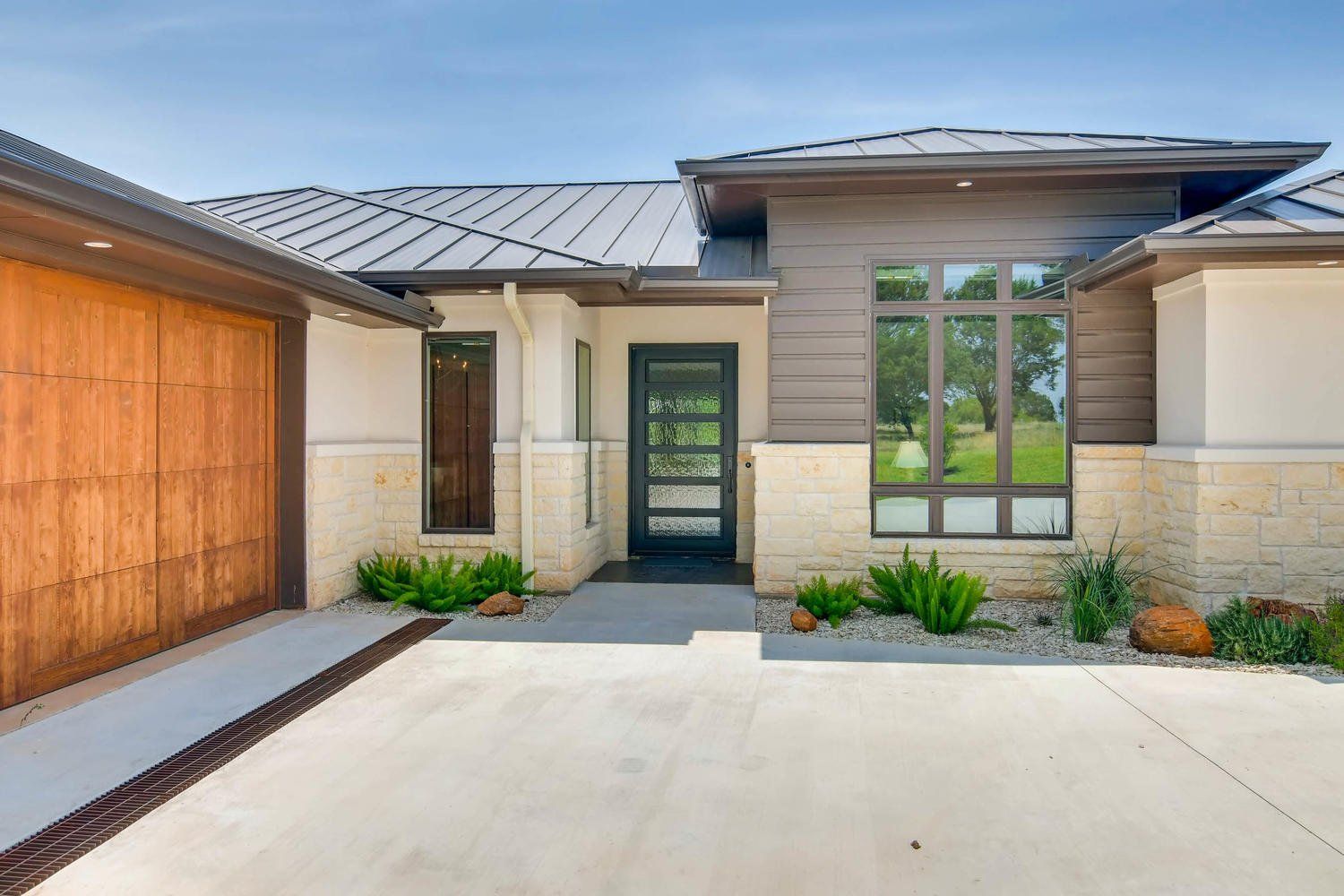 This custom home showcases a tri-veneer front elevation that harkens back to French Country architecture, featuring square picture windows that evoke a Prairie School style with a modern Hill Country flair.