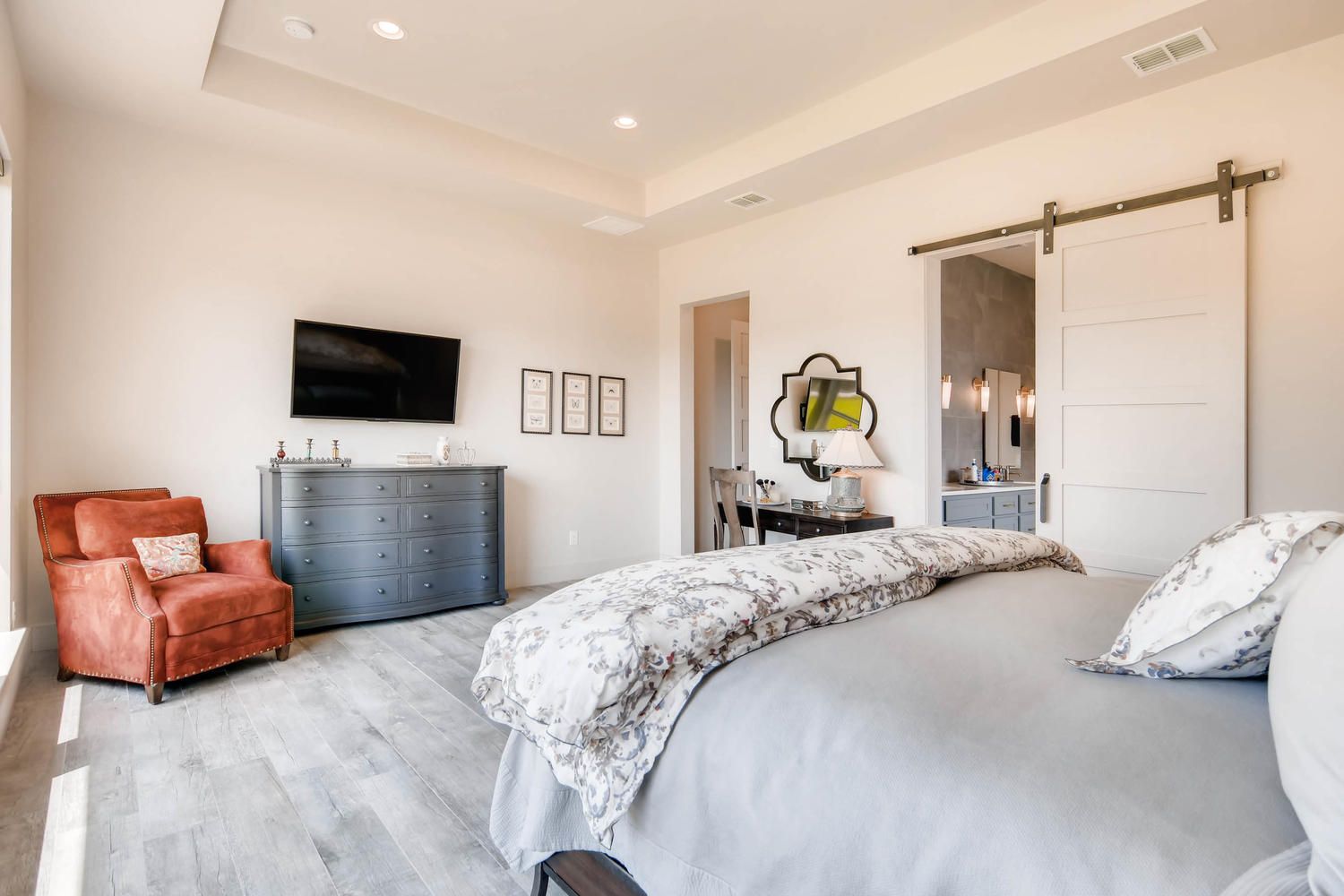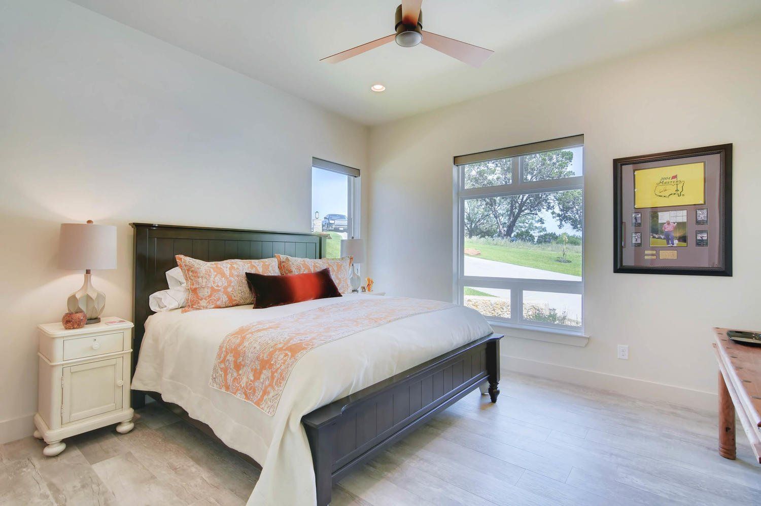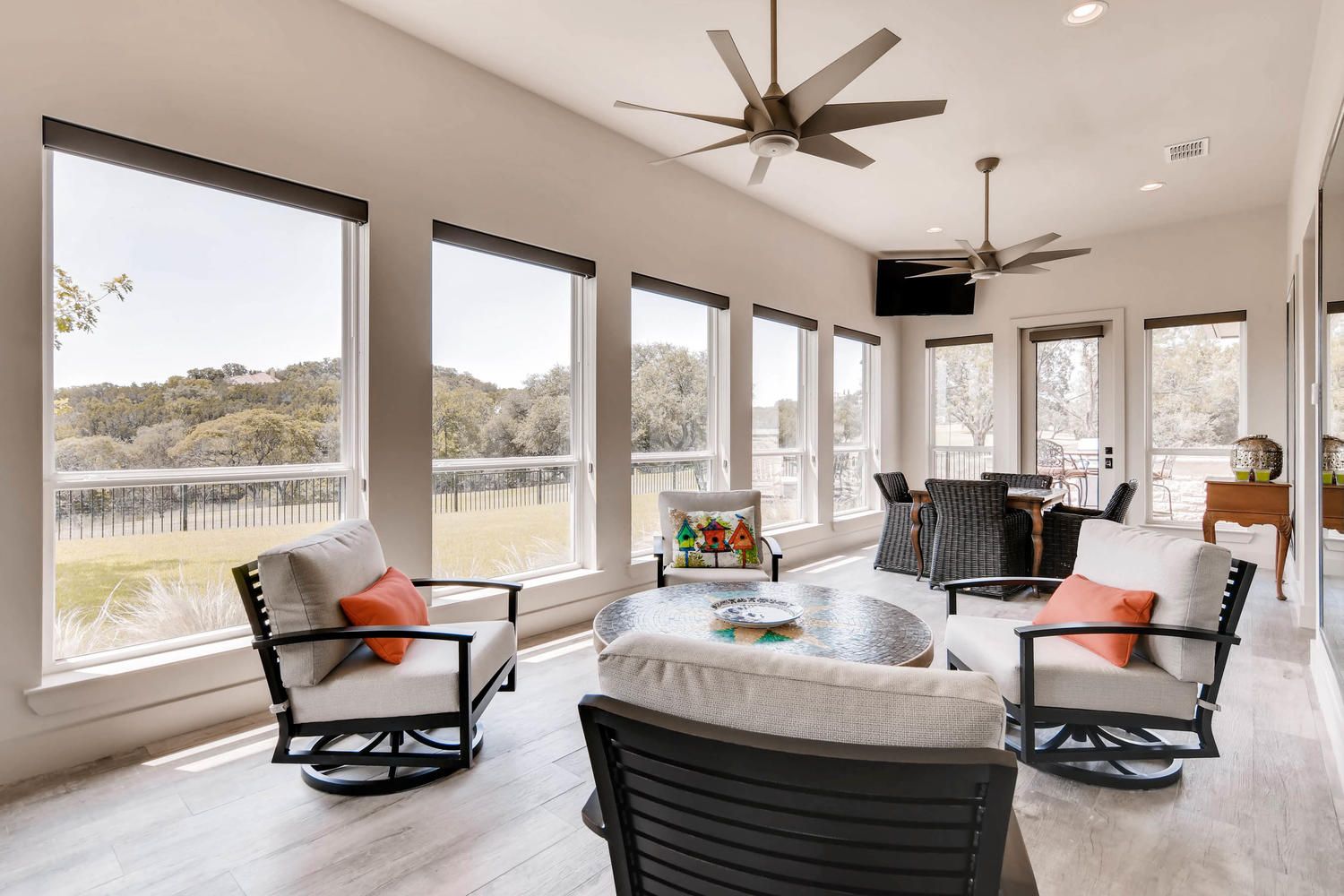 This custom home showcases a tri-veneer front elevation that harkens back to French Country architecture, featuring square picture windows that evoke a Prairie School style with a modern Hill Country flair.