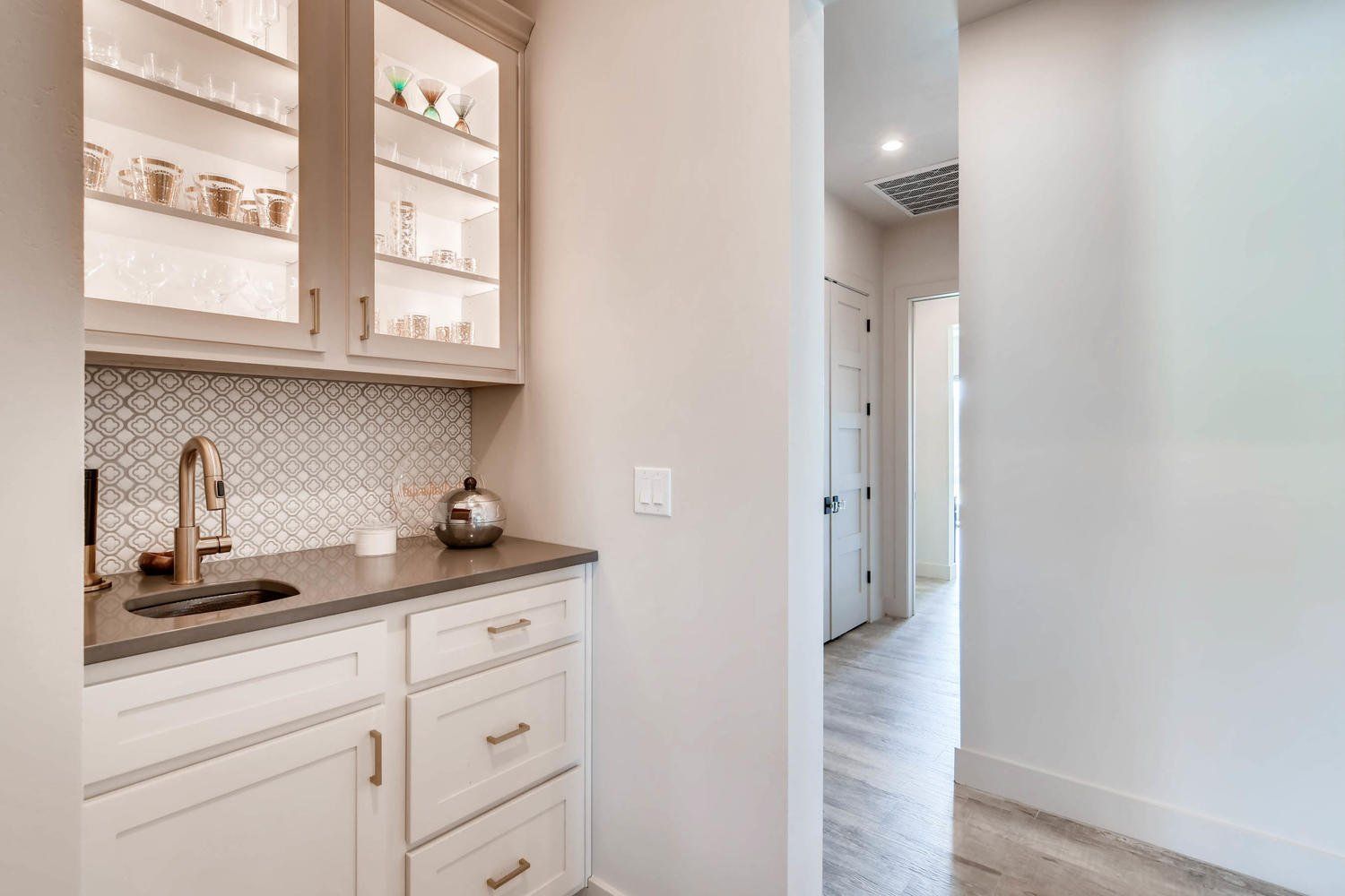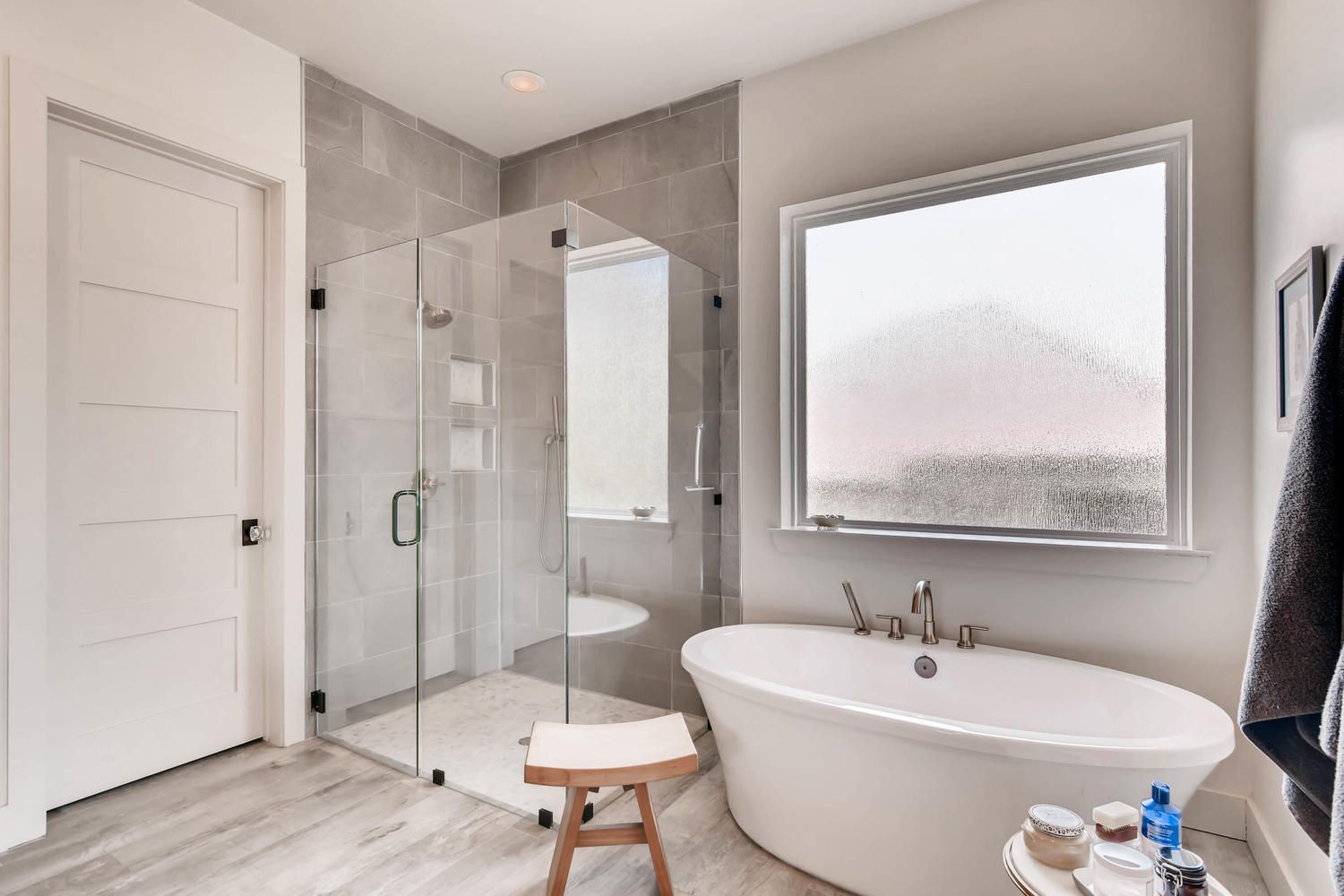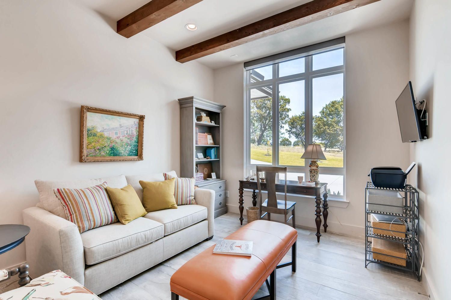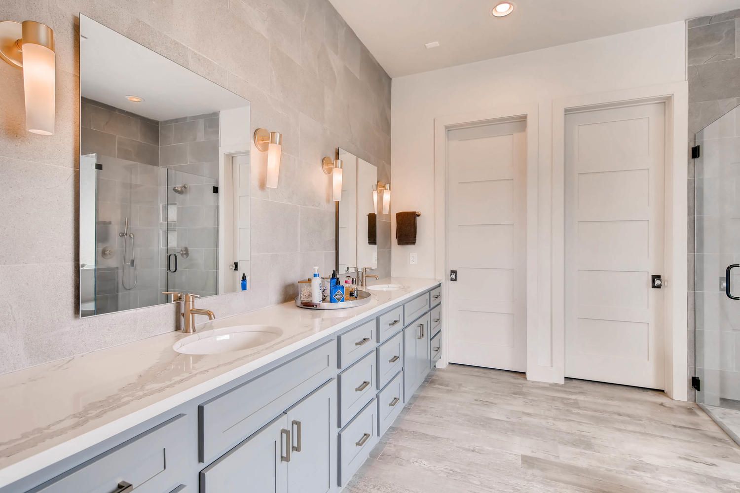 This custom home showcases a tri-veneer front elevation that harkens back to French Country architecture, featuring square picture windows that evoke a Prairie School style with a modern Hill Country flair.